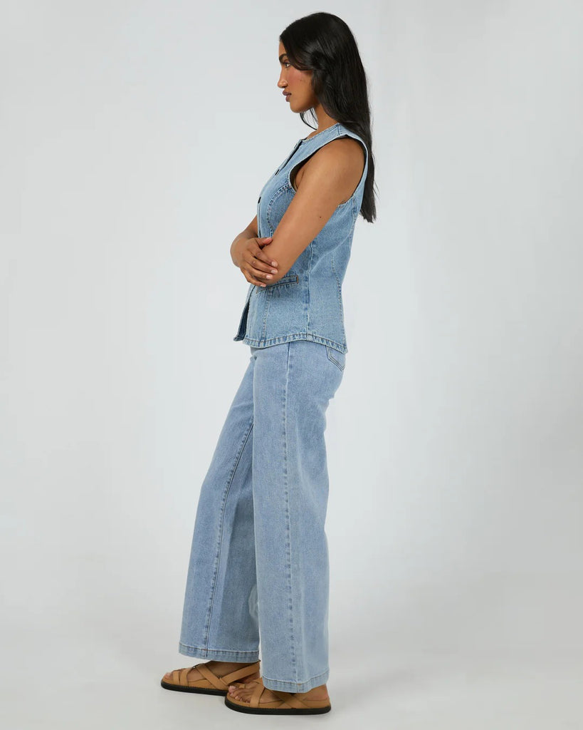 The Lena Denim Vest features a classic button-down front and a stylish split hemline at the torso, offering both comfort and a flattering fit. This versatile piece is perfect for layering, adding a timeless touch to your casual wardrobe while allowing ease of movement throughout your day.