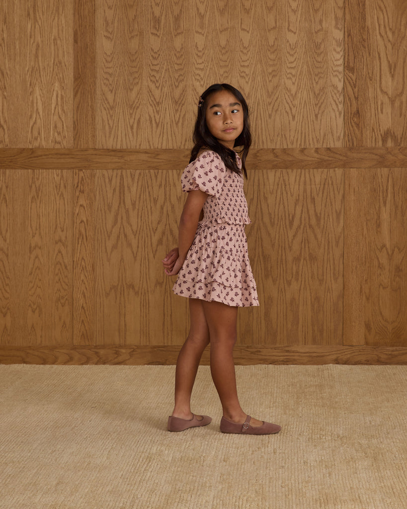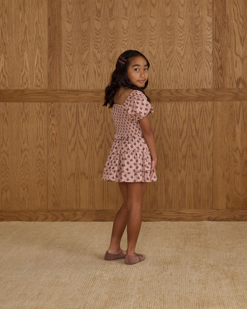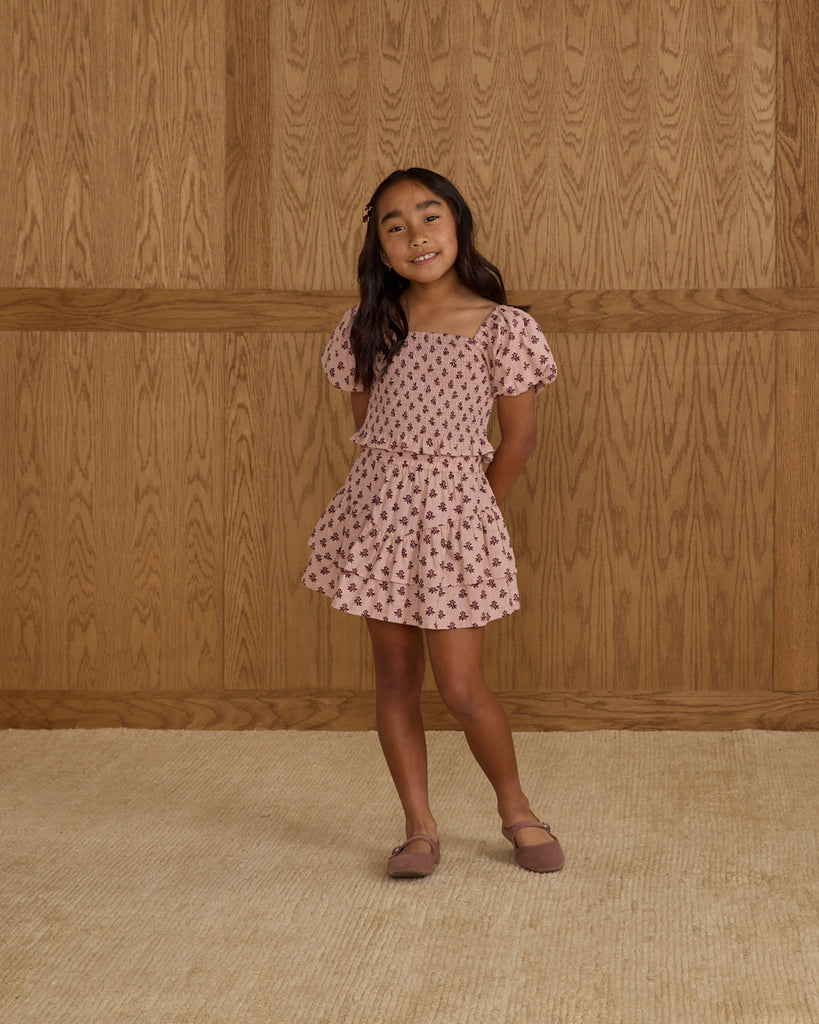 This darling silhouette features two scallop-edged tiers, a flattering V-shaped seam, an elastic waistband, and built-in shorts for added comfort and ease.