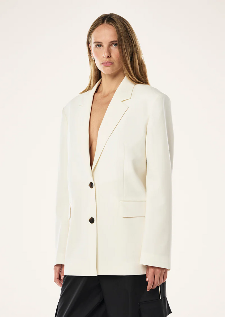 The Residency Blazer in Whisper White & Walnut are made from a wool blend suiting fabrication, this oversized single breasted blazer features an elastic drawcord with a toggle at the back. Style your blazer with denim for an elevated on-duty look.