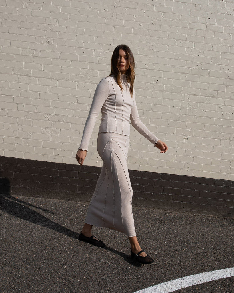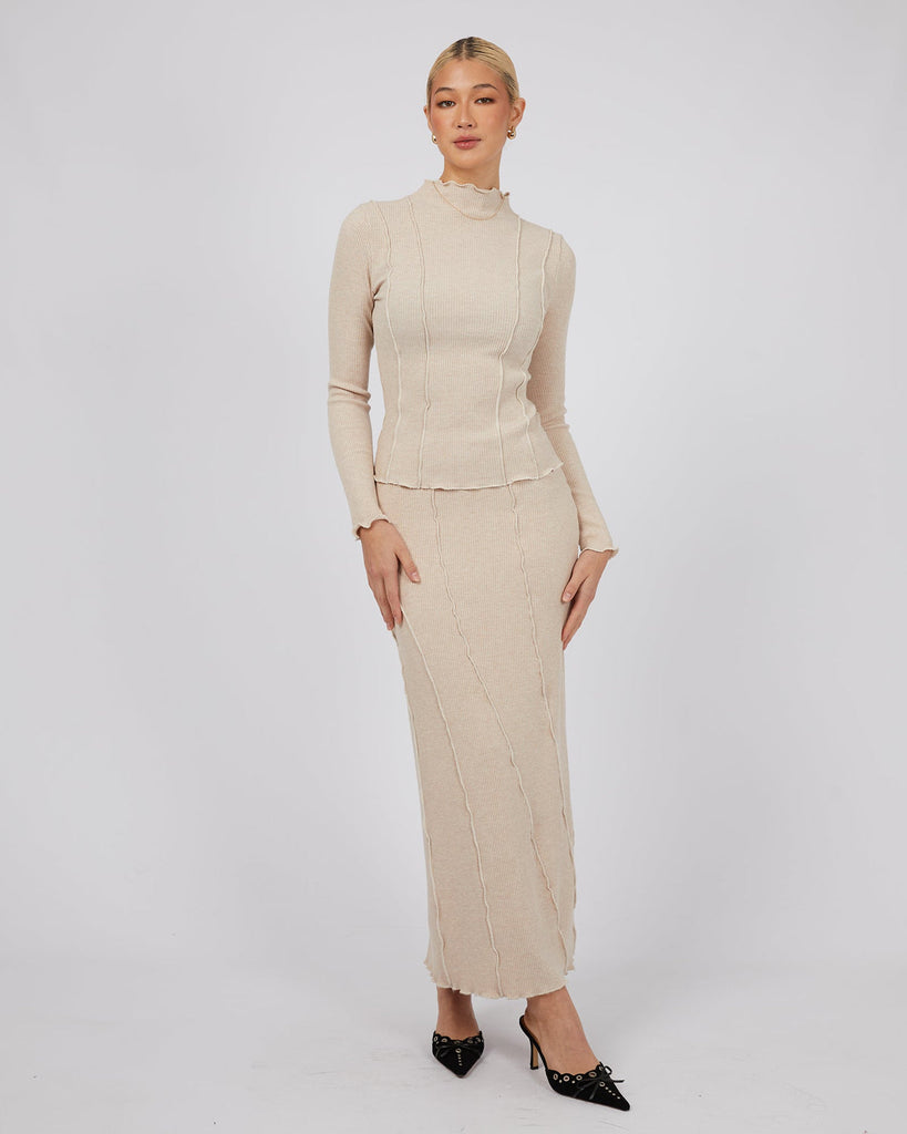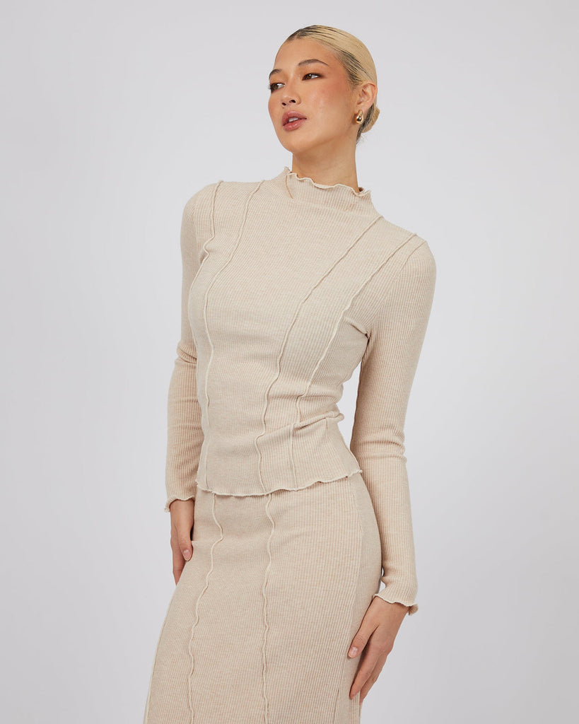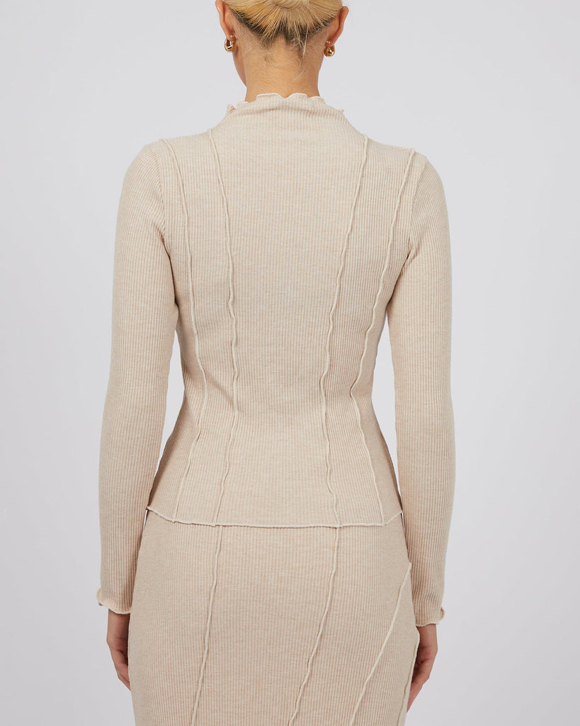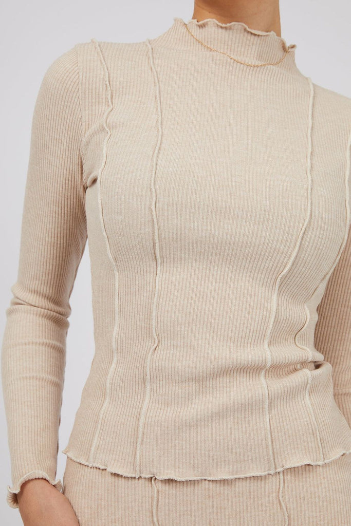The Gemma LS Top is made from a luxe rib knit in a natural marle colour. Featuring a funnel neck, slim fit and exposed seam detailing.
