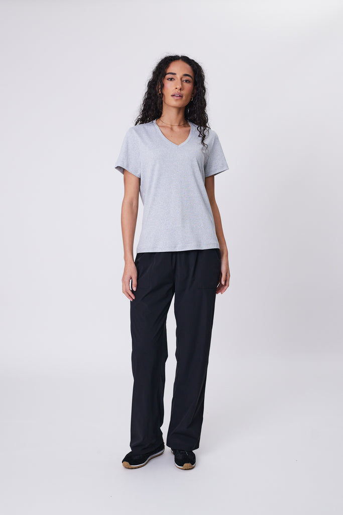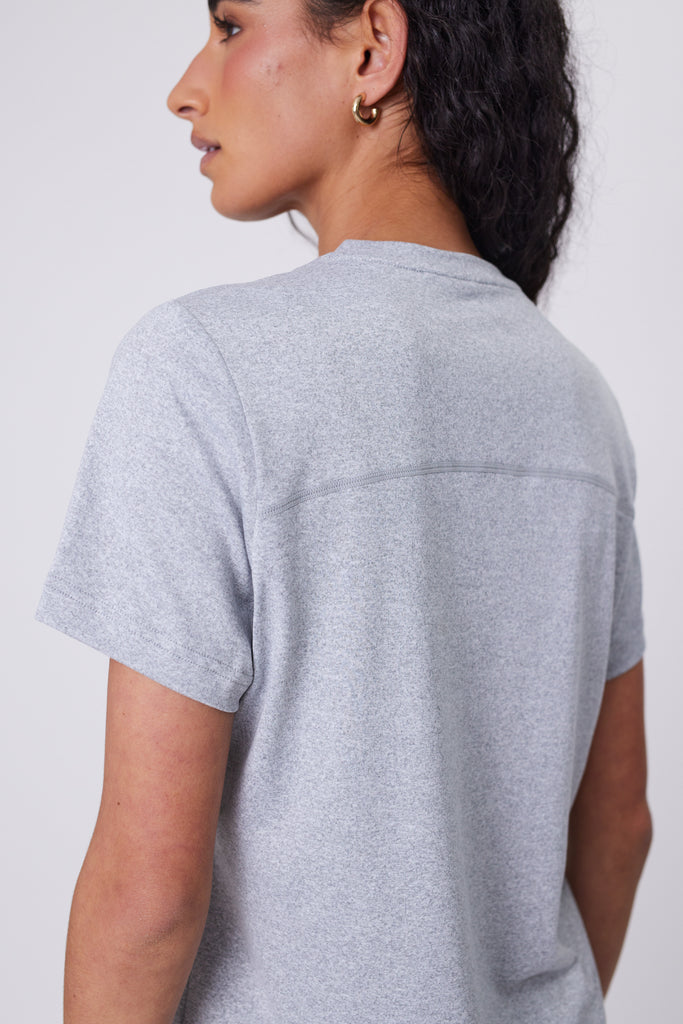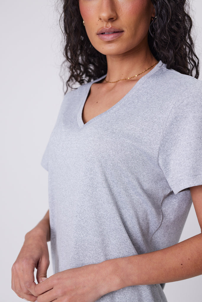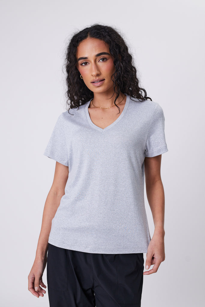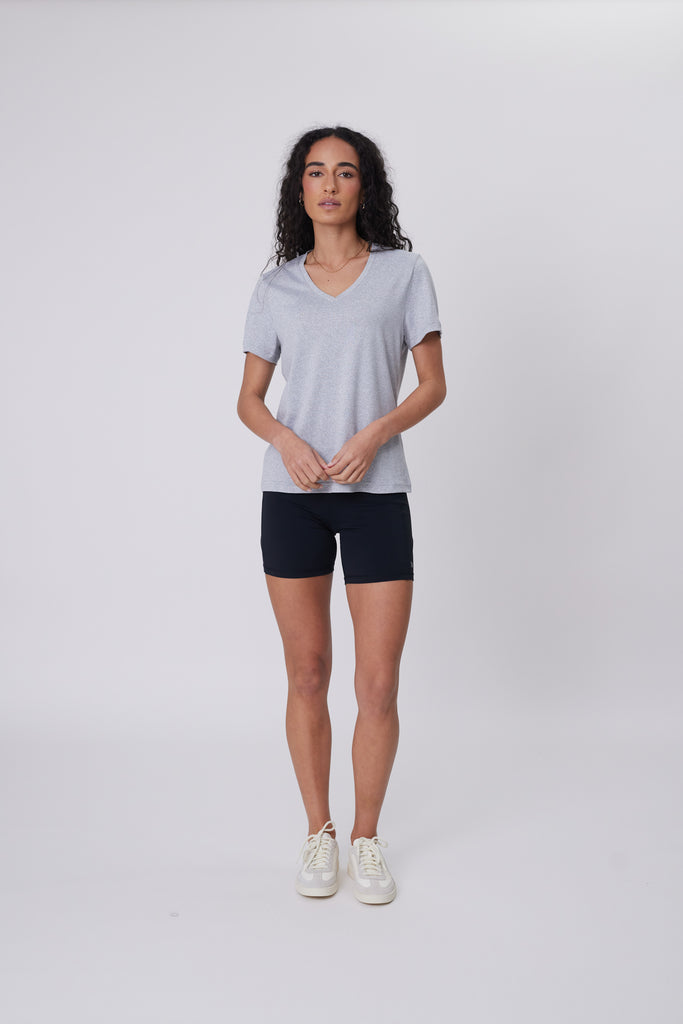 The Half Time V-Neck is an active essential that blends sporty style with comfort, crafted from a soft, stretchy peached jersey fabric that moves with you. Designed with a standard t-shirt fit with a flattering v-neck and curved back seam for a sporty edge. Pair with your favourite Marlow activewear or everyday outfits for a polished yet practical look.