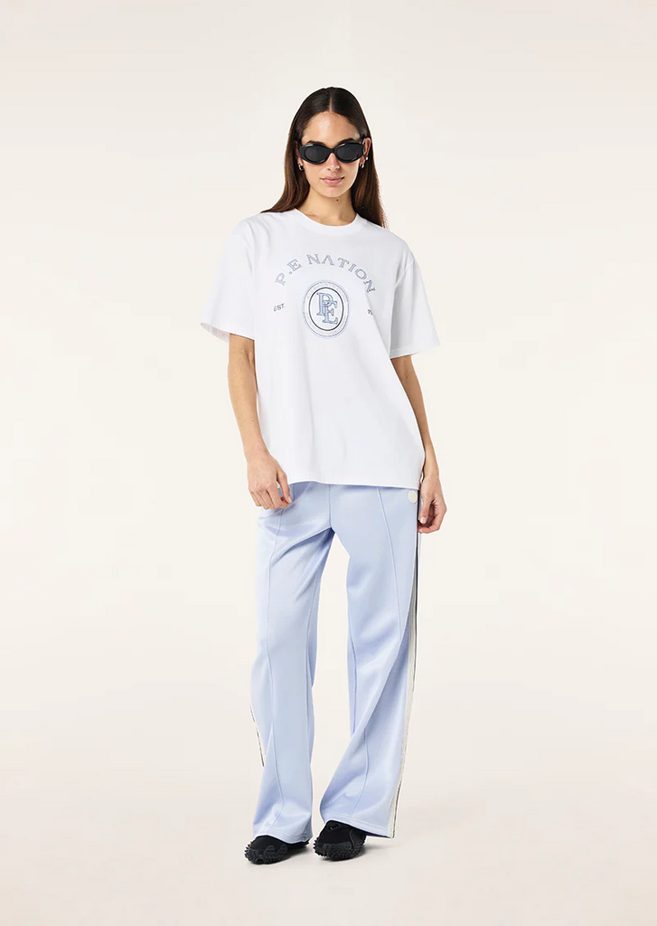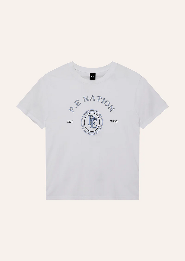 The Voyage Tee in Optic White is made from medium-weight cotton jersey, this oversized fit tee features a rib crew neck and a centre front P.E Nation seasonal graphic. Ideal for exercising or lounging, style this tee with a bike short or trackpant for all-day wearing comfort.