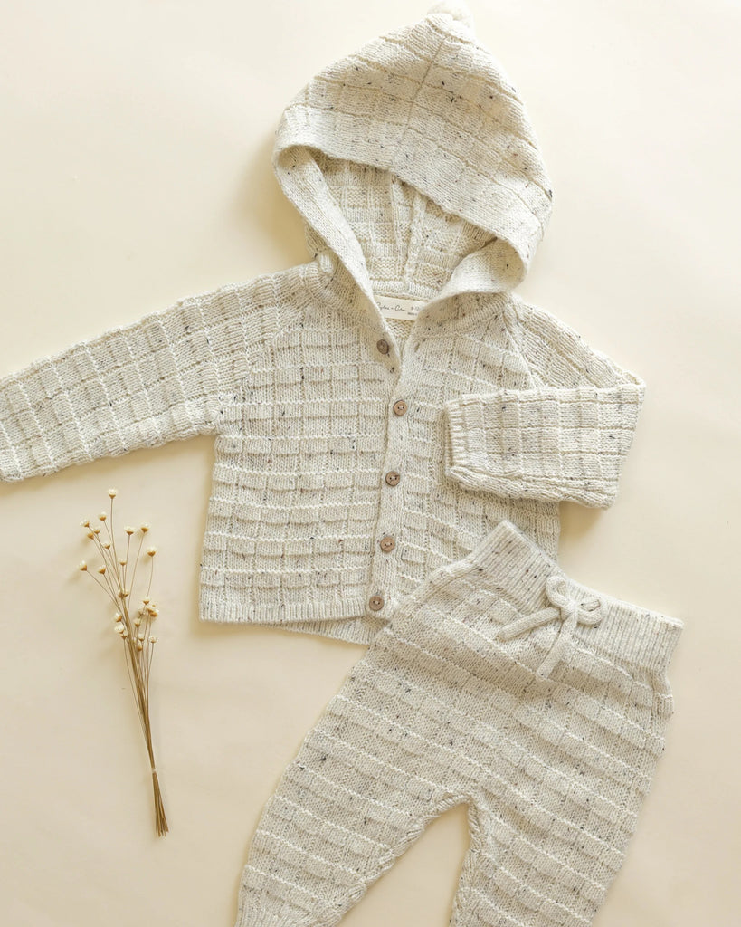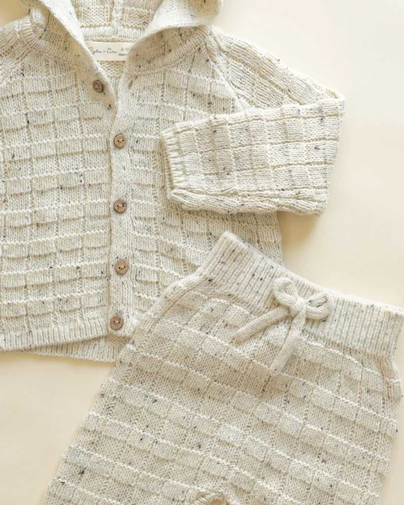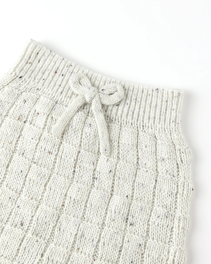 The Gable Pants, crafted in cozy checker sweater knit, feature ribbed trim at the waistband and leg openings, with a charming faux tie detail at the center front.