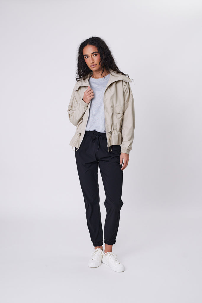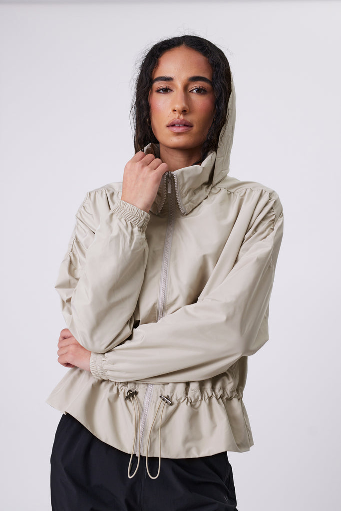 Inspired by a Marlow best-seller, The Fairway Spray Jacket is a trans-seasonal essential designed for everyday wear. With its cropped hip length and adjustable cinched waist featuring a bungee cord, it offers a sleek, fashion-meets-function look. The zip front and concealed hood inside the collar provide versatile protection and style, making it the perfect layering piece to take you seamlessly from the studio to the street. Perfect for all seasons, layer it over dresses or pair it with your favourite Marlow activewear for an everyday sports luxe vibe.