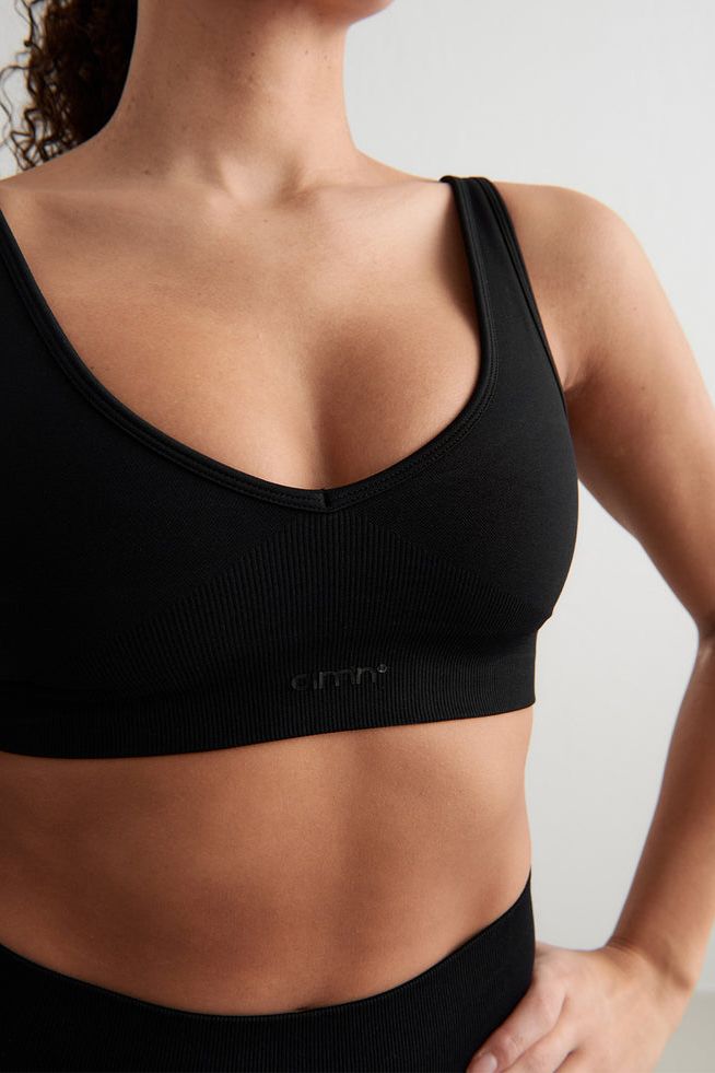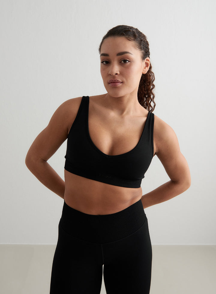 Shape Seamless Deep Cut Bra is made from our soft and stretchy Shape Seamless fabric. The sports bra has a deep cut front and back and ribbed details at front for a contouring effect. The sports bra features light support and has a tonal aim’n-logo at front. Match Shape Seamless Deep Cut Bra with Shape bottoms to create a matching set.